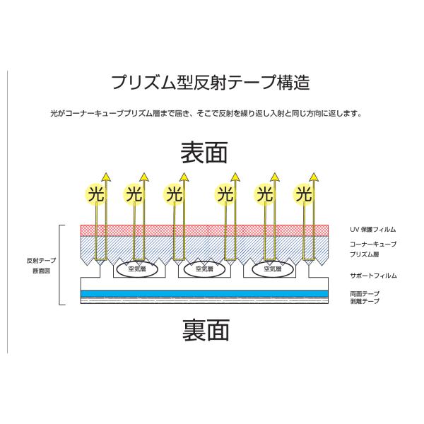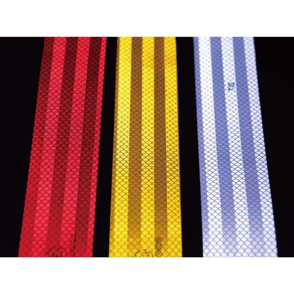 Eマーク適合反射テープ。カットして好きな長さで使用することができます。裏面は強力な両面テープ付き。光がコーナーキューブプリズム層まで届きそこで反射を繰り返し、入射と同じ方向に返します。 サイズ:幅50mm×長さ1M材質:アクリルテープカラー:赤色 メーカー名:株式会社ジェットイノウエ