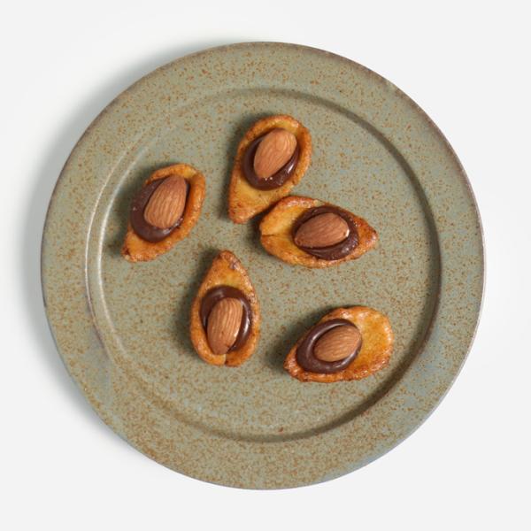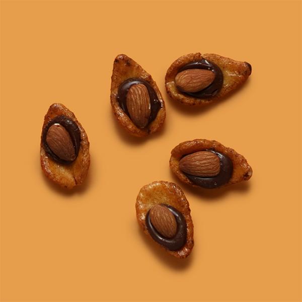 国内産水稲もち米のおかきと、ほろ苦いスイートチョコ、それと丸粒のアーモンド。