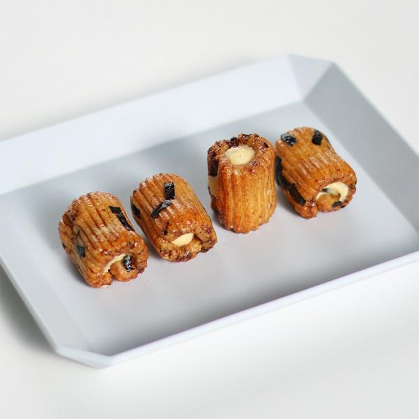 国内産水稲もち米のおかきに、きざみ海苔をふりかけ、その中に、特選スモークチーズが詰まっています。