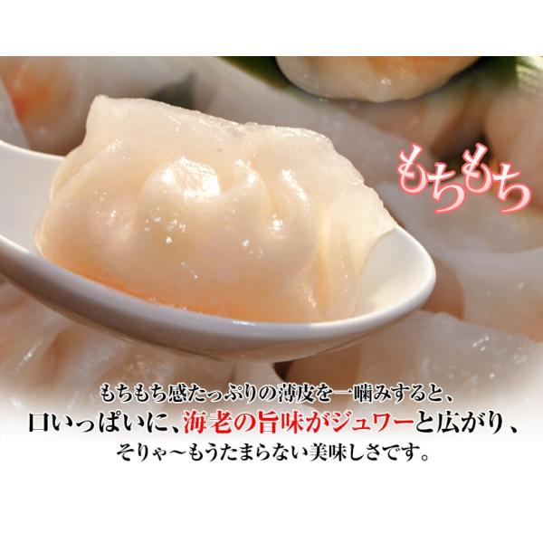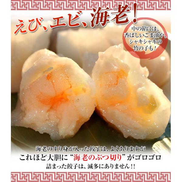 もちもちの皮の中には、すり身ではなくブツ切りのエビがたっぷり入っています。 バラ凍結ですので、使いたい分だけお使いいただけて大変便利。凍ったまま蒸したりチンしたり、スープに入れたり、解凍して焼き餃子にするのもオススメ!! 色々な楽しみ方ができる当店の看板商品です!!
