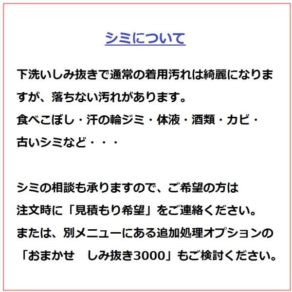 または、別メニューのカテゴリ「追加処理オプション」「しみ抜き3300円」もご検討ください。