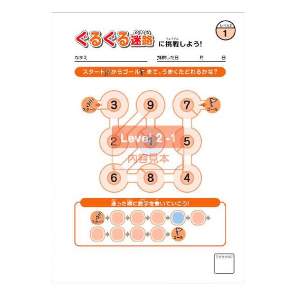 目と手を連動する力を鍛えるトレーニングブック「ぐるぐる迷路」は、スタートからゴールまで行き止まりにぶつからずに、枠からはみ出さないよう線を引き、枠の中の数字や文字を辿った順に記入欄に書き込みます。