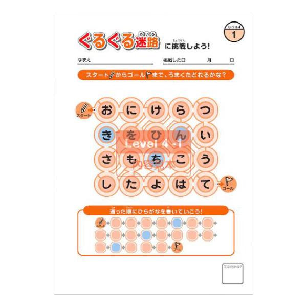 文字を正確に書くためには、目で形や位置を確認しながら生活に鉛筆を動かす必要があり、そのために必要な様々な基礎能力を身につけるトレーニングを「ぐるぐる迷路」で行うことができます。レベルが上がると、難易度も増していきますよ!オールカラーで見やすいので楽しみながらトレーニングを進めることが出来ます。