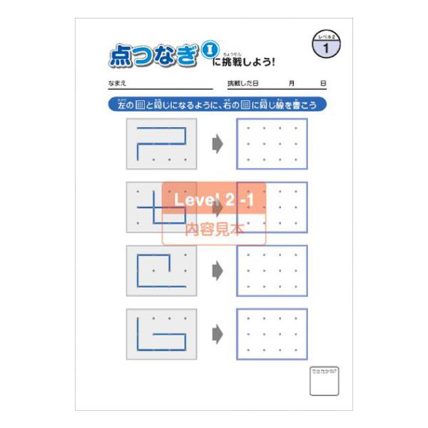 形と空間を捉えるチカラを鍛えるトレーニングブック。見本と同じ図形になるように点を結んでいきます。レベルが上がるにつれて見本の図形が複雑になり、また、見本の点の数と、トレーニングの点の数が違ってくるので、空間を捉える力が必要になってきます。
