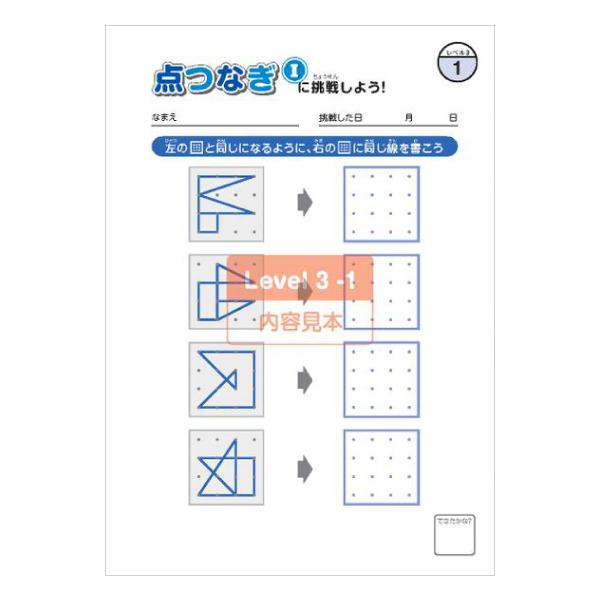 形と空間を捉えるチカラを鍛えるトレーニングブック。見本と同じ図形になるように点を結んでいきます。レベルが上がるにつれて見本の図形が複雑になり、また、見本の点の数と、トレーニングの点の数が違ってくるので、空間を捉える力が必要になってきます。