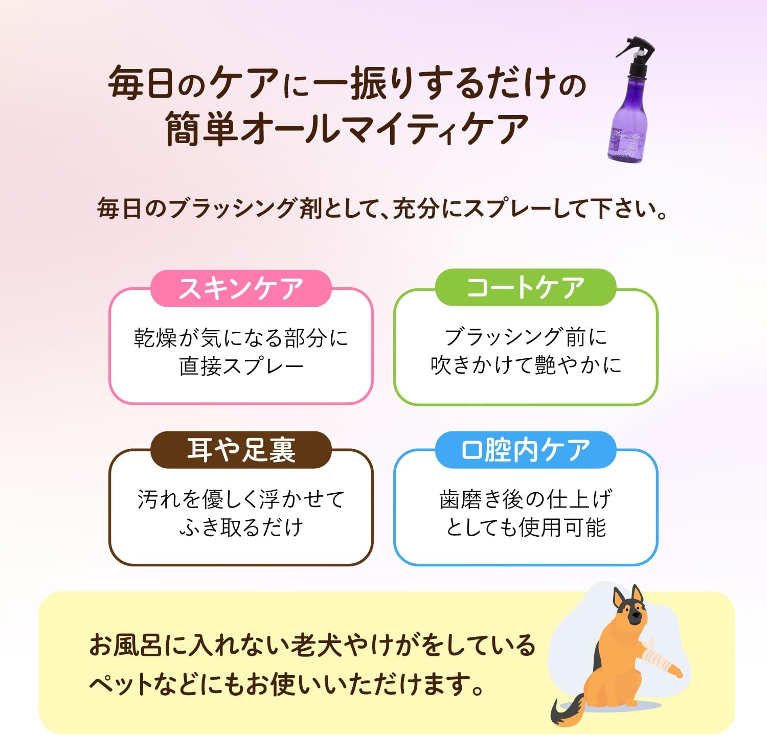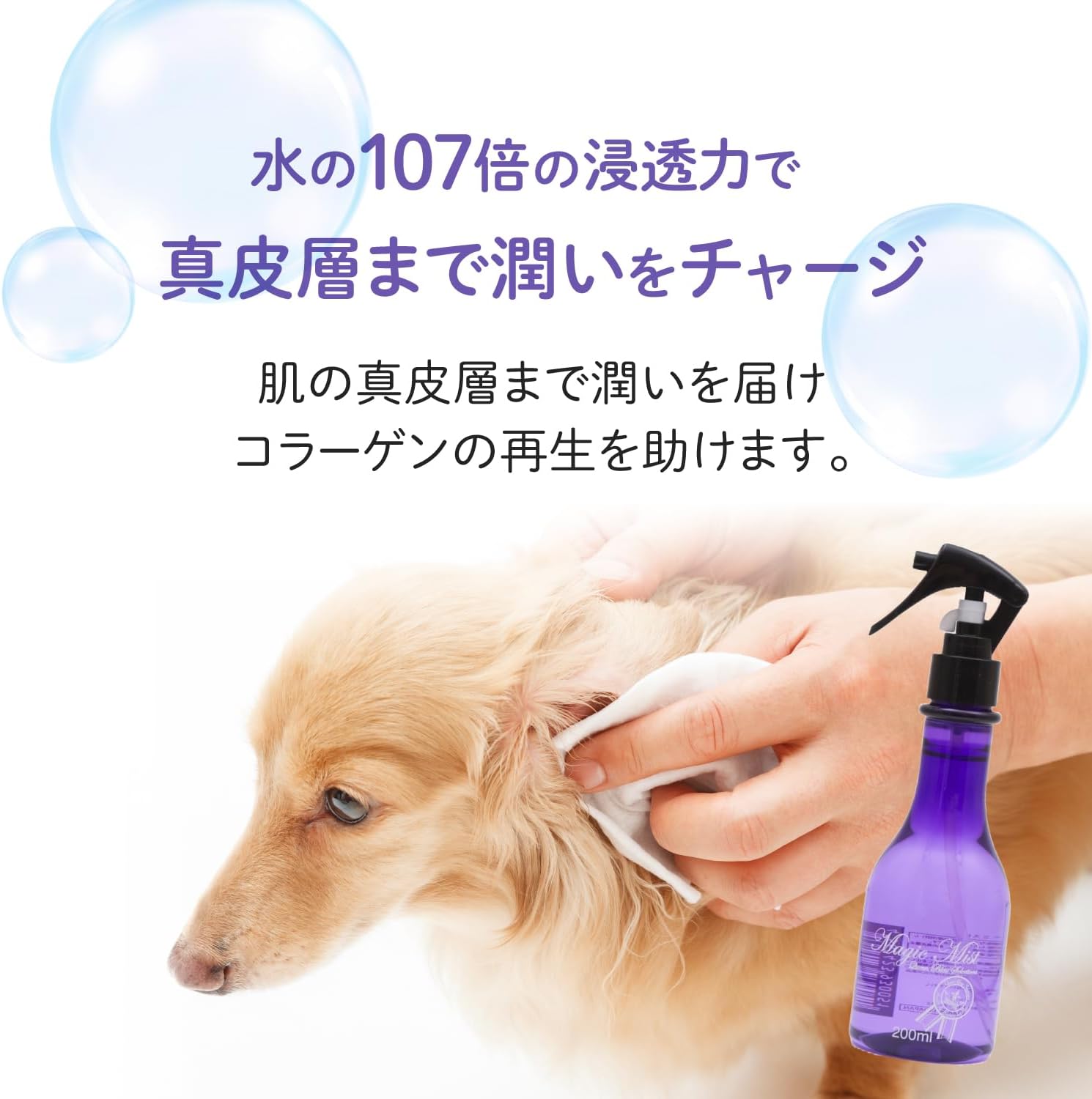 マジックミスト は、超純水を特殊な技術で電気処理し電子を持たせた高いアルカリ性をした安心・安全な水です。高い抗菌性と水の107倍の浸透性を持ち肌の真皮層まで潤いを届けコラーゲンの再生を助けます。また、乳化効果が高いため毎日の衛生的なお手入れの為にペット犬・高齢犬・子犬・ショードックなどあらゆる犬・猫・ウサギたちに使用が出来ます。使用方法は簡単。 スプレーでシューと一吹き。