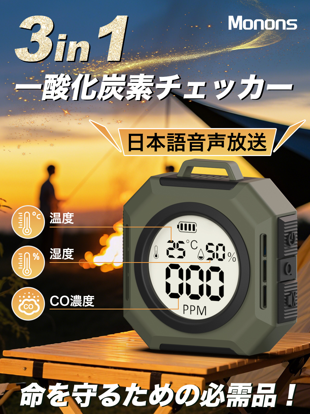 【2025年新登場・日本アウトドア専用設計】モノンズ(Monons) 大画面・大文字・大音量 日本語音声 乾電池付き 一酸化炭素検知器 一酸化炭素警報器 キャンプ 85dB大音量 アラーム 静音機能 24時間監視 30日以上超長待機 秋冬キャンプ/テント用/車中泊/アウトドア 日本語説明書付き