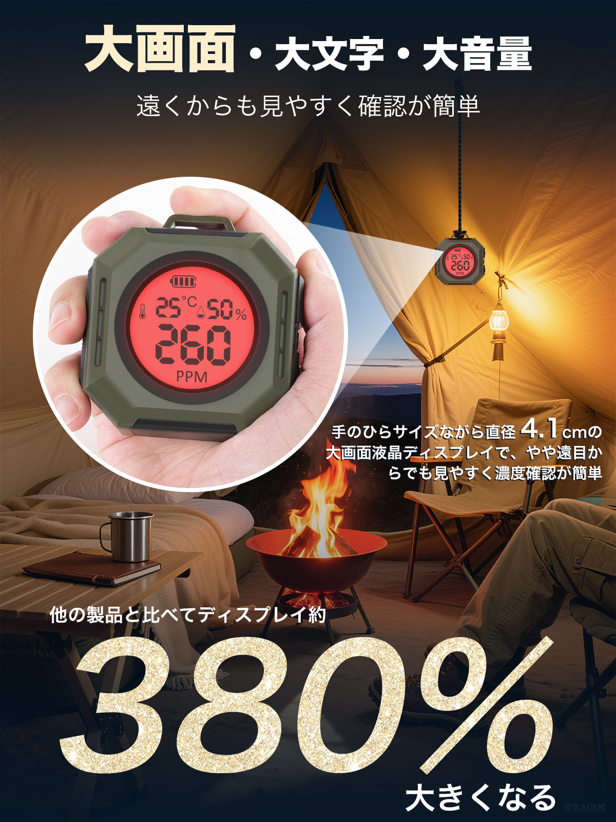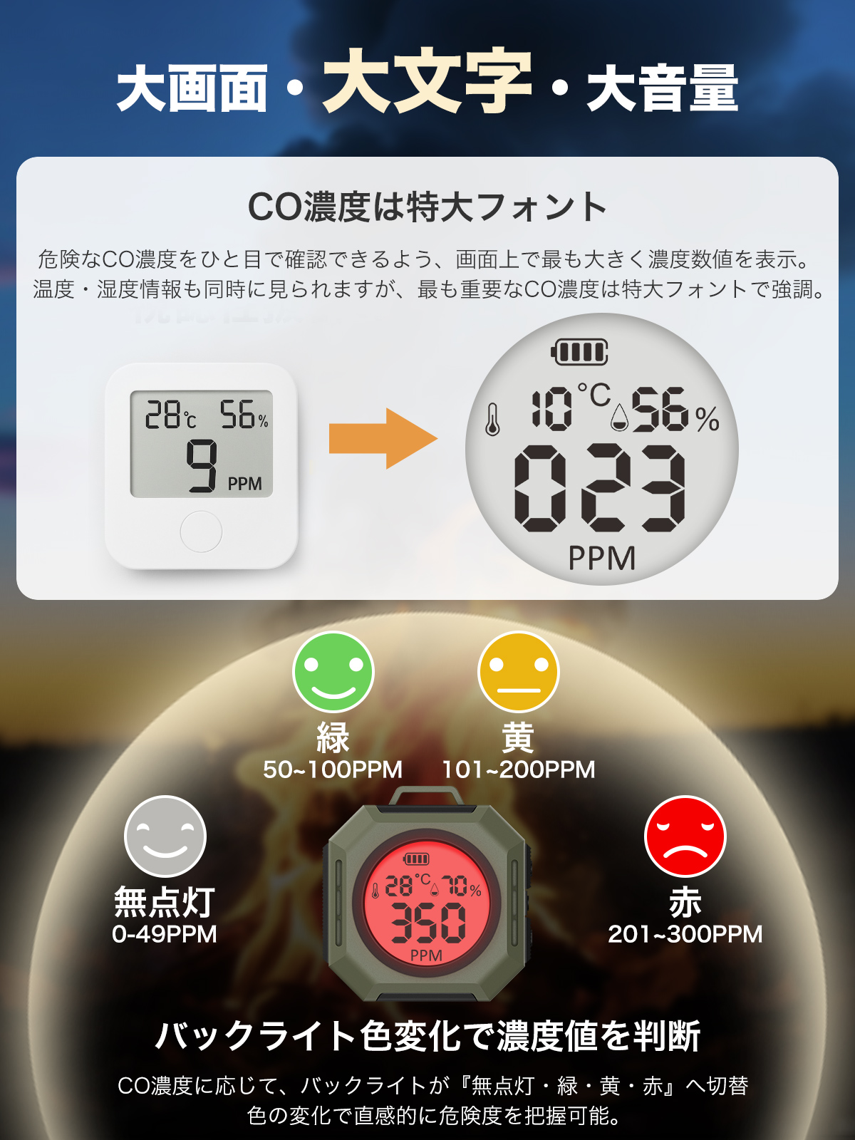 『新登場 日本アウトドア専用設計』一酸化炭素チェッカー 3in1一酸化炭素濃度/温度/湿度 高精度/瞬間検知 大画面/大文字/大音量
