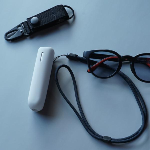 同色のストラップが付属。首から下げたりバッグに掛けて持ち運びやすく、落下防止にも役立ちます。(クリアとグローはブラックのストラップとなります)