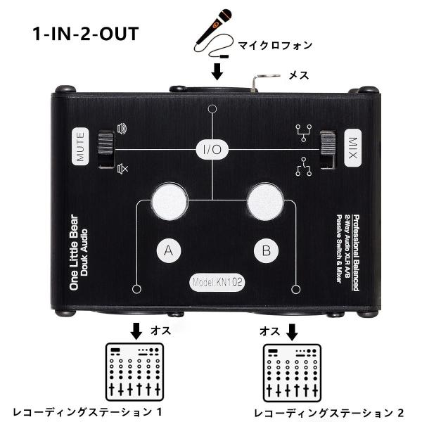 1つのオーディオソース(アクティブなマイクやMIDIキーボードなど)をI / Oポートに、2つのオーディオレシーバーデバイス(レコーダー/マイクミキサーなど)をA / Bポートに接続します。