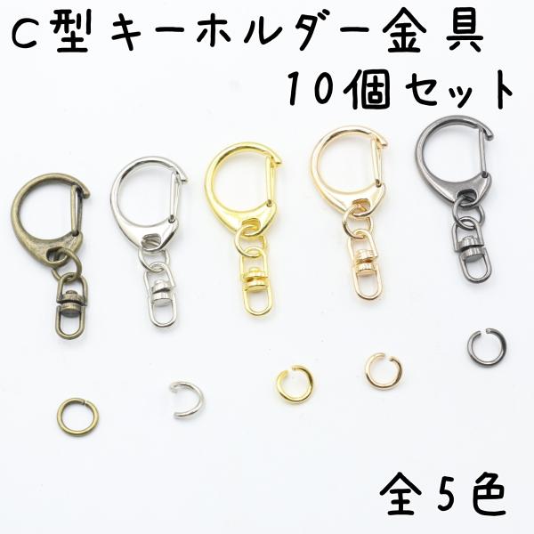 C型 キーホルダー金具 10個セット 全5色 ワンタッチナスカン 回転カン・丸カン付 C型ナスカン キーホルダー金具 キーホルダー ゴールド シルバー ブラック