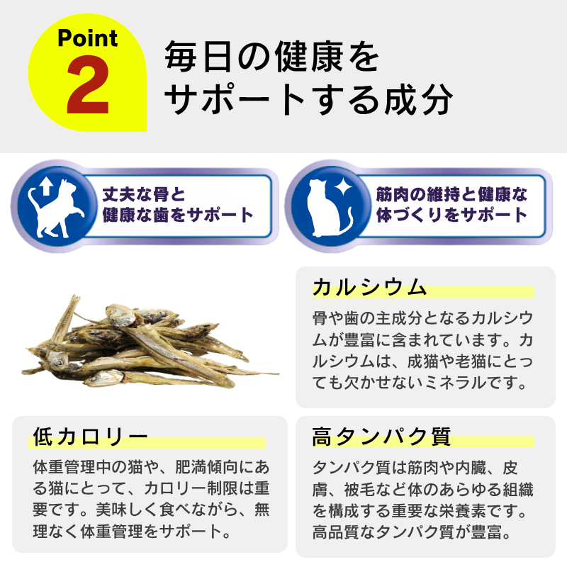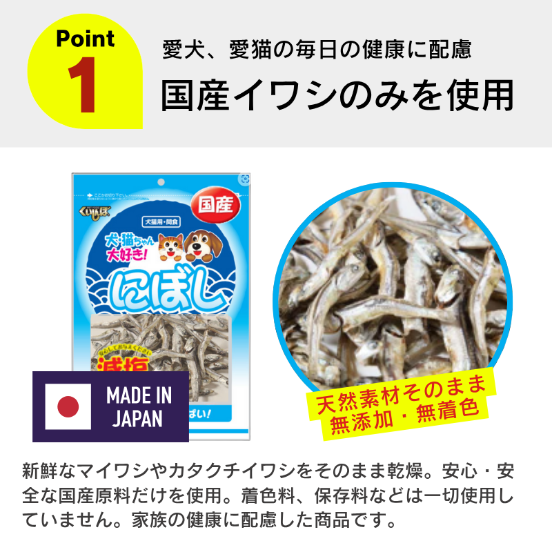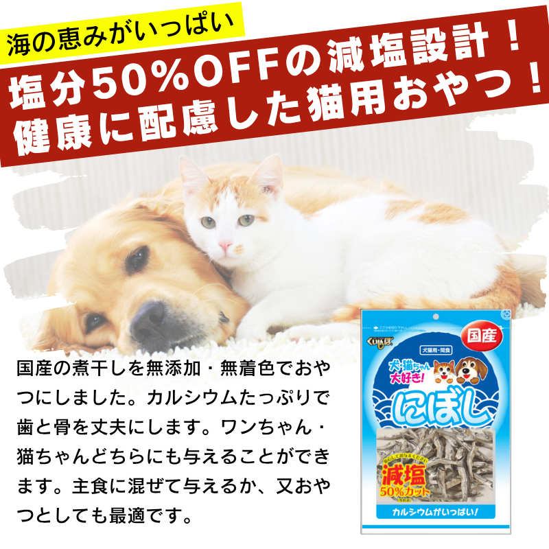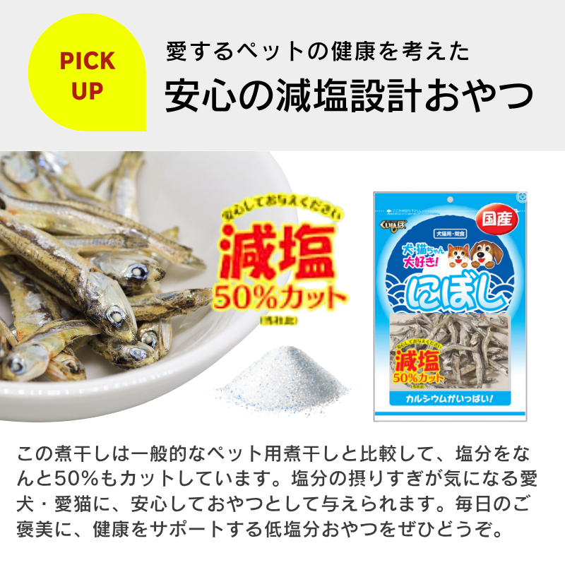 カルシウム豊富!国産にぼしで、健康なおやつタイム。国産の煮干しを無添加・無着色でおやつにしました。カルシウムたっぷりで歯と骨を丈夫にします。わんちゃん・猫ちゃんどちらにも与えることができます。主食に混ぜて与えるか、又おやつとして最適です。塩分が気になるワンちゃん・ネコちゃんに。"くいしんぼ 犬・猫ちゃん大好き にぼし"と比べて、塩分を50%カットしています。