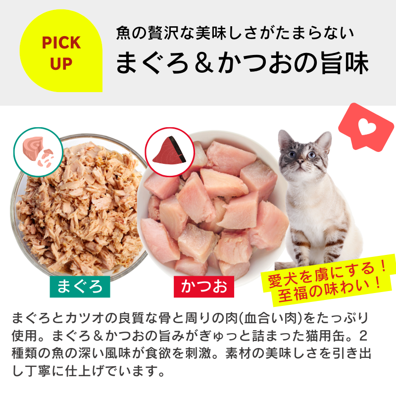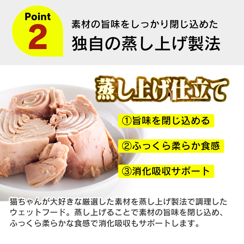 新鮮素材の旨さ際立つ”蒸し上げ仕立て”。本商品は、愛猫の健康と食欲を追求し、厳選された素材を贅沢に使用したウェットフードです。蒸し上げることで、素材本来の旨味と水分を閉じ込め、ふっくらジューシーな食感に仕上げました。愛猫の食欲をそそる豊かな香りと、とろけるような口当たりは、毎日の食事はもちろん、食欲不振時のサポートやご褒美にも最適です。 賞味期限:製造より3年