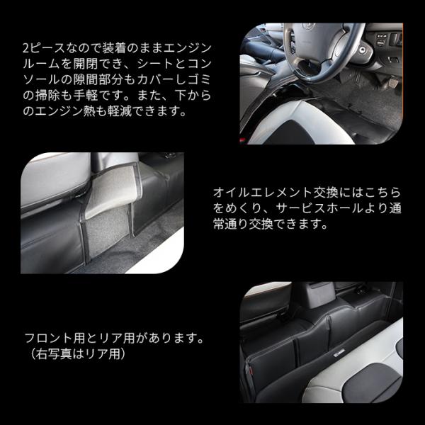 2ピースなので装着のままエンジンルームを開閉でき、シートとコンソールの隙間部分もカバーするので、ゴミの掃除も手軽になります。
