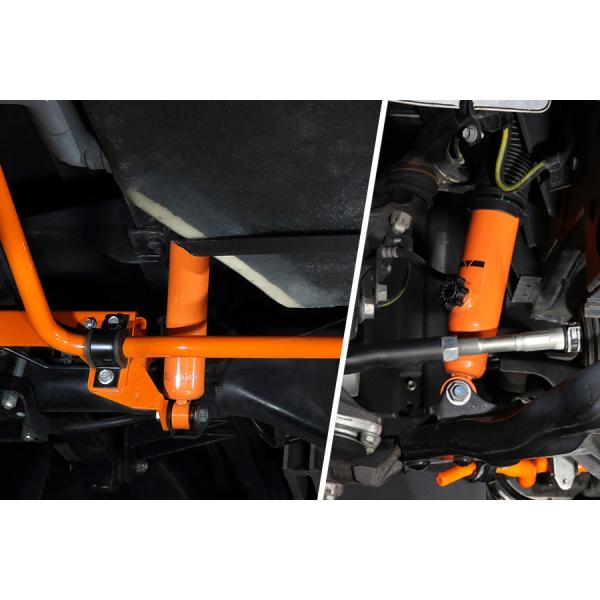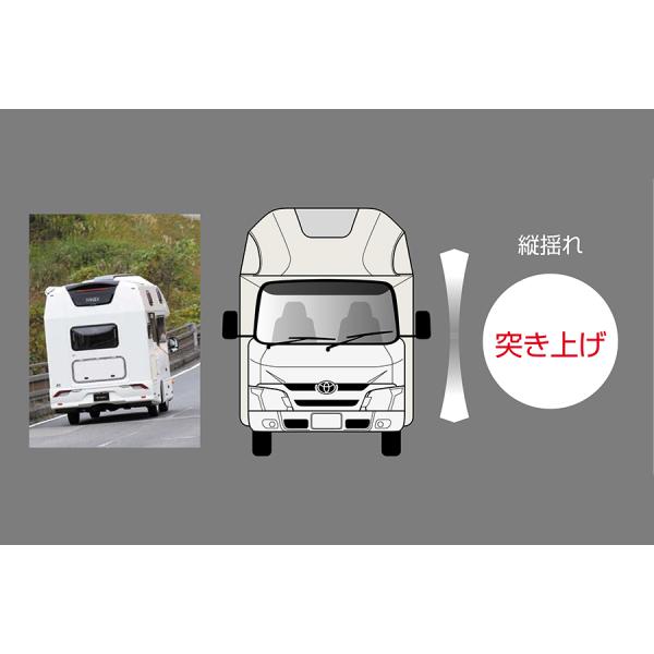 積載量や乗車人数でショックへの要求値が大きく変わるハイエースで培ったノウハウを余さず注ぎ、フロントは搭載エンジンや車両重量、好みに応じた味付けが可能な14段階の減衰力調整、架装の重量増で優れたショック性能が欠かせないリアは、理想の乗り味を引き出すために減衰力固定でなければ不可能な減衰力を与えました。
