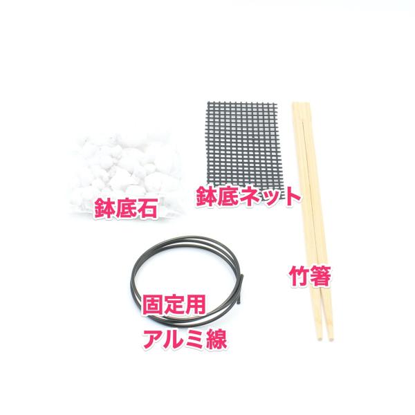 5号(直径約15センチ)程度の鉢を用いる盆栽の植え替えに必要な消耗品類一式です。個々に買い揃えるより無駄がなく経済的です。