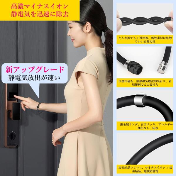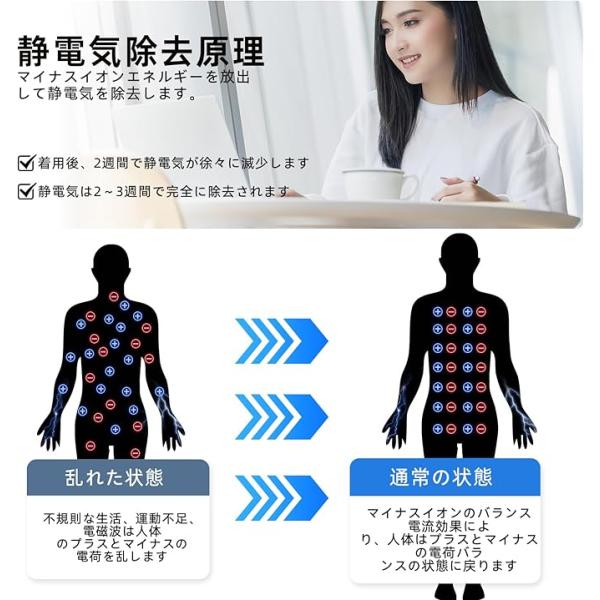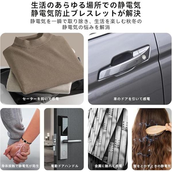 身につけるだけで体に帯電した静電気をゆっくり逃がし、ドアノブ・車・衣類に触れる際の不快なショックを防ぎます。