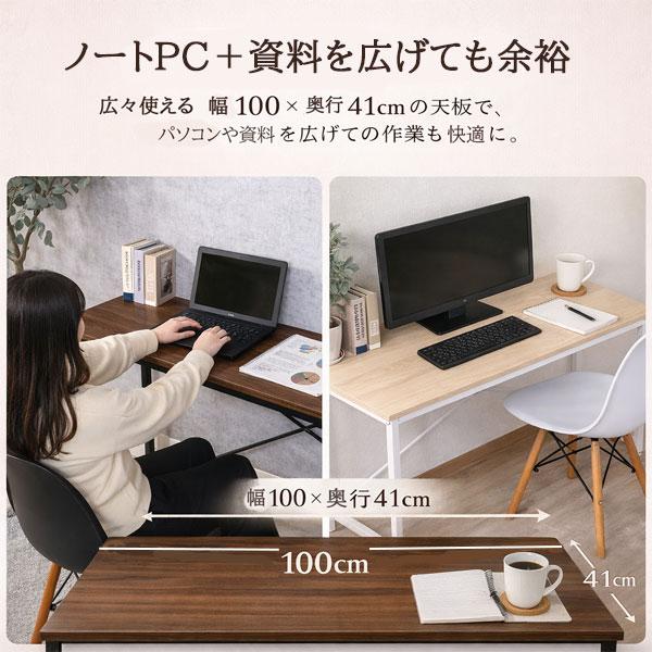 幅100cm・奥行41cmの天板は、ノートパソコンや資料を広げても使いやすく、在宅ワークや学習など日常の作業に取り入れやすいサイズ感です。