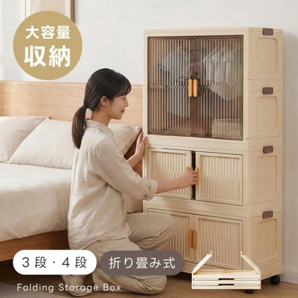 収納ボックス 折りたたみ 前開き ふた付き 半透明&アイボリー 収納ケース 3/4段 キャスター付 おしゃれ 衣類/布団収納 大容量 小物収納 プラスチックコンテナ