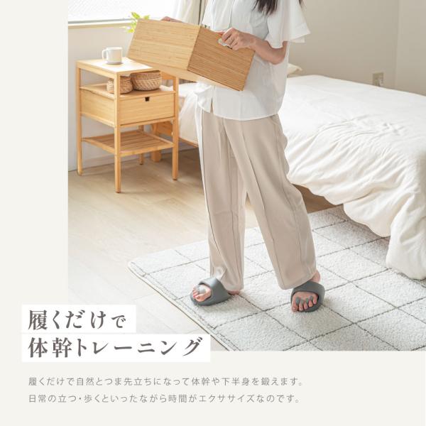スリッパを履くだけで自然とつま先立ちの状態になり、下半身や体幹を無理なく鍛えることができます。