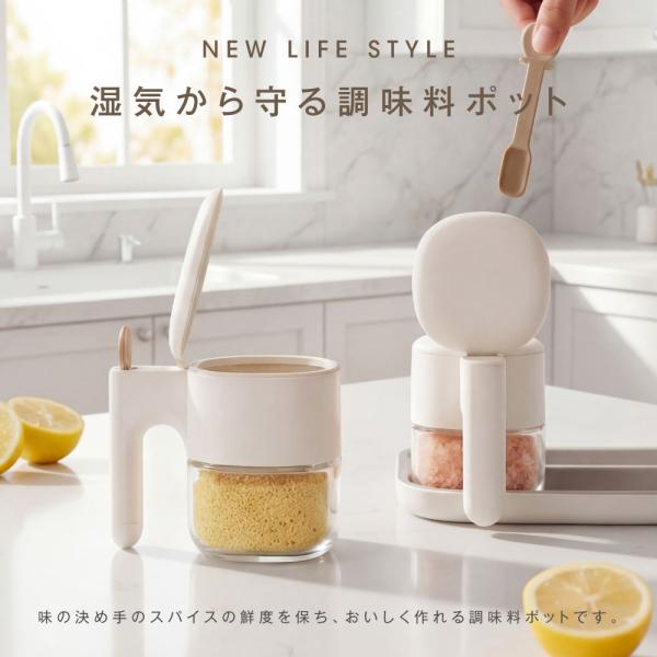 【自動オープン】わざわざフタを手で開ける必要ナシ!スプーンを引き出すと同時にフタが開く調味料保存ポット。片手でサッと扱えて毎日のキッチンも気分が上がります。