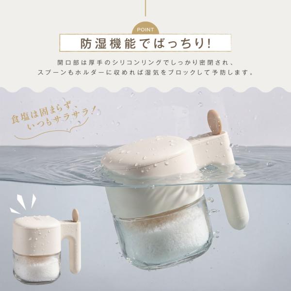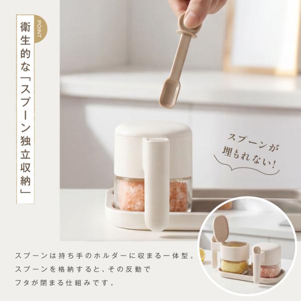 【スプーン独立収納】スプーンは持ち手のホルダーに収まる一体型。スプーンを格納すると、その反動でフタが閉まる仕組みです。スプーンはひとさじ3.5gの計量サイズにすることで、料理レシピに合わせて、ぴったりの味付けを可能にしています。