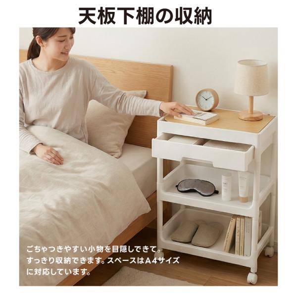 【天板下棚の収納】ごちゃつきやすい小物を目隠しできて。すっきり収納できます。スペースはA4サイズに対応しています。天板下には浅めの収納スペース。天板でホコリの侵入を防ぎ、生活感を見せたくない小物を目隠しできます。外した状態でも使用できます。
