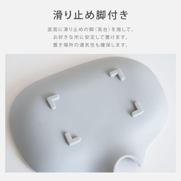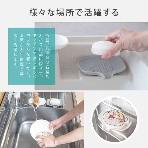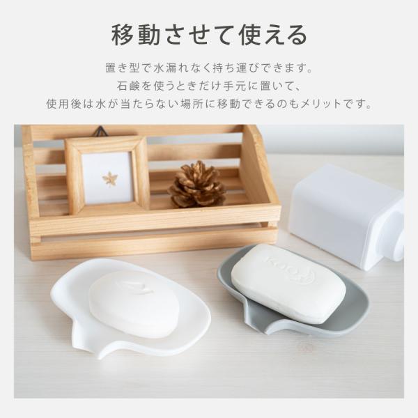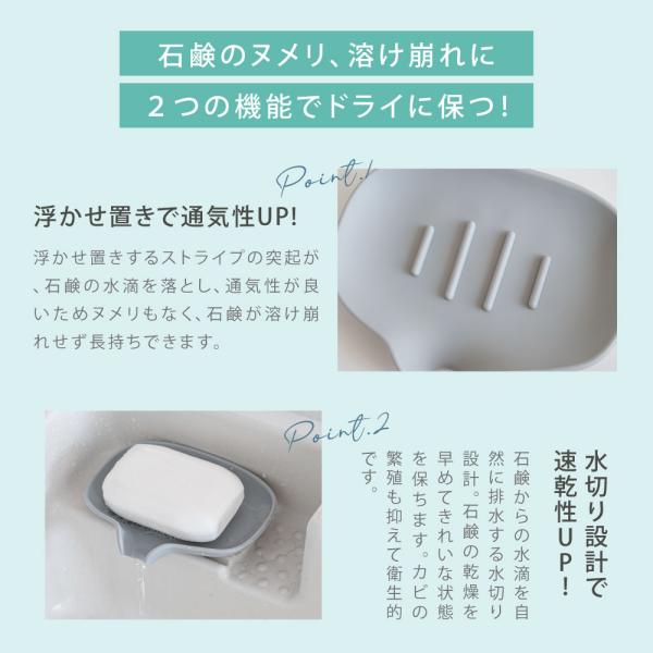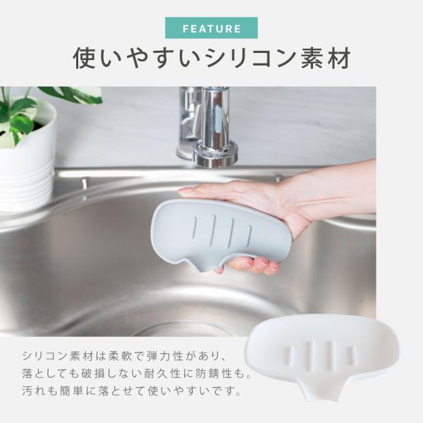 【シリコン素材】シリコン素材は柔軟で弾力性があり、落としても破損しない耐久性に防錆性も。汚れも簡単に落とせて使いやすいです。シリコンは吸水性を持たないため、汚れも洗剤でサッと洗うだけで簡単にお手入れでき、繰り返し使えます。 【2つの機能でドライに保つ!】浮かせ置きするストライプの突起が、石鹸の水滴を落とし、通気性が良いためヌメリもなく、石鹸が溶け崩れせず長持ちできます。石鹸からの水滴を自然に排水する水切り設計。石鹸の乾燥を早めてきれいな状態を保ちます。カビの繁殖も抑えて衛生的です。 【移動させて使える】置き型で水漏れなく持ち運びできます。石鹸を使うときだけ手元に置いて、使用後は水が当たらない場所に移動できるのもメリットです。 【滑り止め脚付き】底面に滑り止めの脚を施して、お好きな所に安定して置けます。置き場所の通気性も確保します。石鹸の水滴は落とし排水をする。自然に早く乾燥できてサラサラに!だからいつもキレイに保てます。