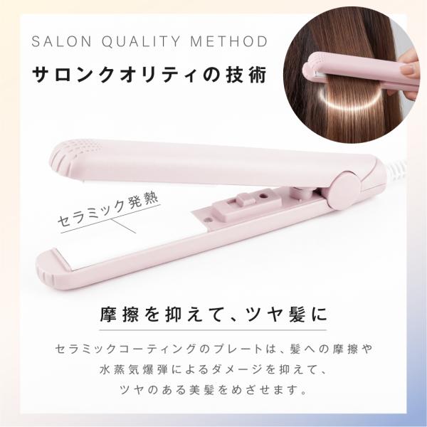 【サロンクオリティの技術】セラミックコーティングのプレートは、髪への摩擦や水蒸気爆弾によるダメージを抑えて、ツヤのある美髪をめざせます。プレート背面のラウンドバックはカールやウェーブも叶えます。巻きやすくて前髪や顔まわりのニュアンスづけも手軽です。