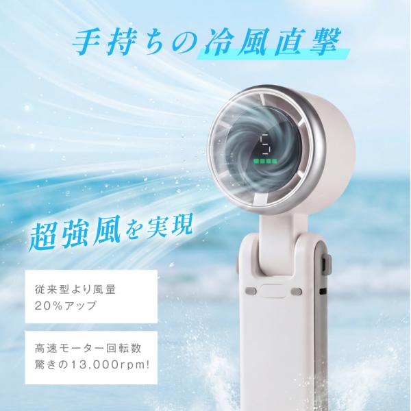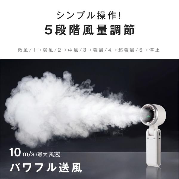 【5段階風量調節】最大風速10m/Sの超強風を実現。ハンディなのにサーキュレーター級の風力で暑さを吹き飛ばします。弱風から強風までボタンひとつのシンプル操作。