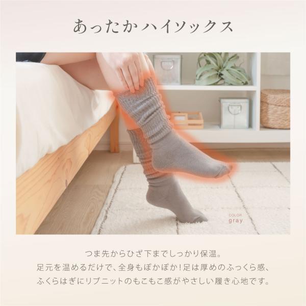 【あったかハイソックス】つま先からひざ下までしっかり保温。足元を温めるだけで、全身もぽかぽか!足は厚めのふっくら感、ふくらはぎにリブニットのもこもこ感がやさしい履き心地です。