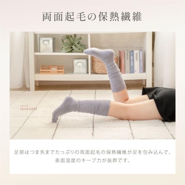 【両面起毛の保熱繊維】足部はつま先までたっぷりの両面起毛の保熱繊維が足を包み込んで、表面温度のキープ力が抜群です。裏側に細畝のリブニットの2枚合わせで冷たい空気を感じない。暖かさがアップし、ズレない快適フィットにこだわっています。