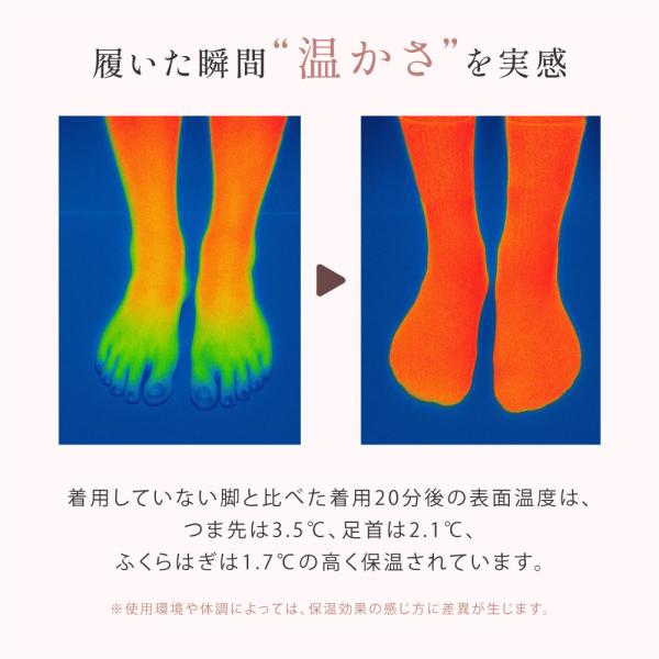 【履いた瞬間“温かさ”を実感】着用していない脚と比べた着用20分後の表面温度は、つま先は3.5°C、足首は2.1°C、ふくらはぎは1.7°Cの高く保温されています。