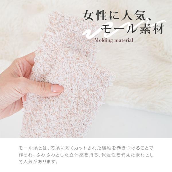 【女性に人気、モール素材】モール糸とは、芯糸に短くカットされた繊維を巻きつけることで作られ、ふわふわとした立体感を持ち、保温性を備えた素材として人気があります。