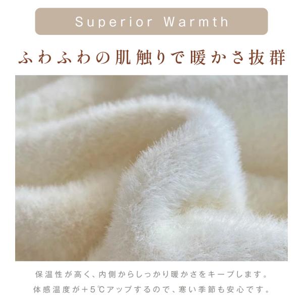【ふわふわの肌触りで暖かさ抜群】表面は柔らかいニット素材、裏面ふんわりとした起毛生地。保温性が高く、内側からしっかり暖かさをキープします。体感温度が+5°Cアップするので、寒い季節も安心です。