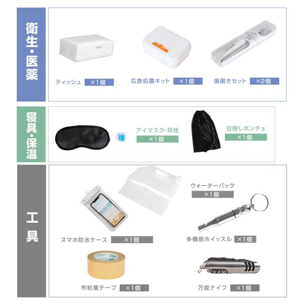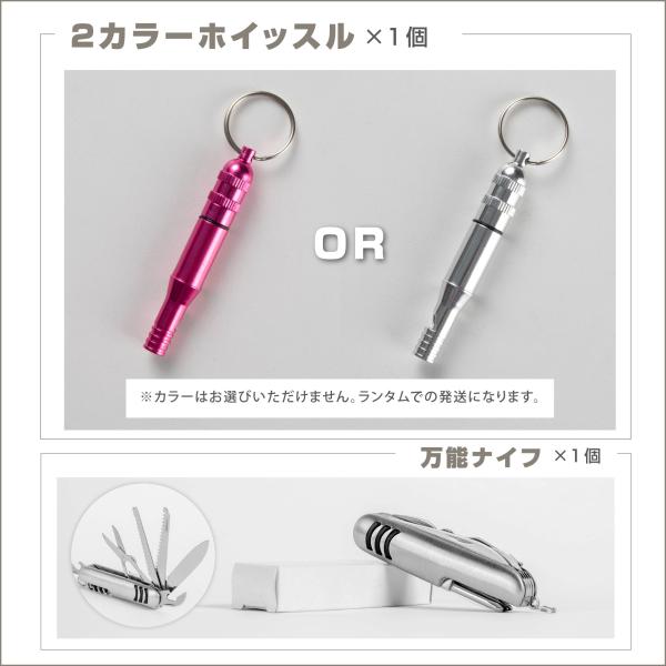 【工具用品】万能ナイフx1/布粘着テープx1/多機能ホイッスルx1/ウォーターバックx1/スマホ防水ケースx1