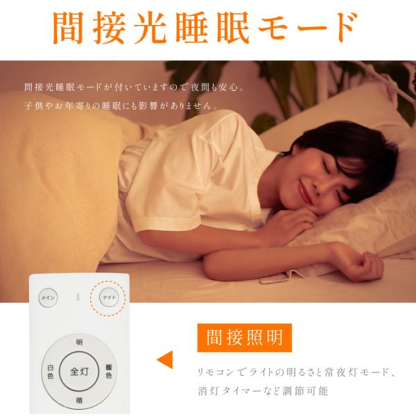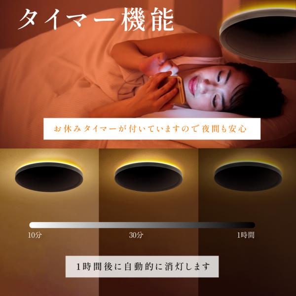 【12段階調光・調色】12段階の調光・調色は自由なライティングが可能です。裏面発光により浮遊感のある間接照明の上品な印象を与えます。リモコンで光の色と明るさを変えられるから、暮らしのシーンやお部屋に合わせて手軽にあかりの切り替えが出来ます。【便利な機能】目に優しい常夜灯モードが 付いていますので夜間も安心。 子供やお年寄りの睡眠にも 影響がありません。ボタンを押すだけで簡単にお休みタイマーがセットできます。 10分後/30分後/1時間後に自動的に消灯します。