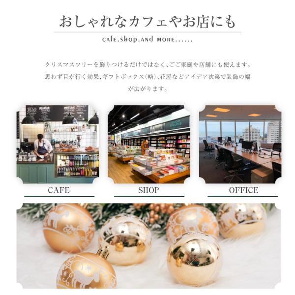 【応用範囲】自宅の他にもお店やレストラン バー イベント会場 スクールなどにもおススメです。ツリー本体のシルエットが美しいほど、着飾った時の印象が全く異なります。程よいスリム感バランスの取れた枝の配置は葉を丁寧に広げることで、溜息が出る程美しい三角形の立ち姿となります。