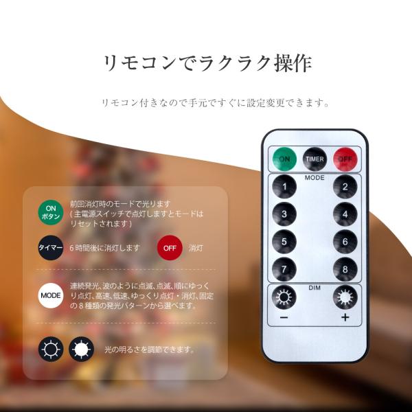【100LED&柔軟性】led イルミネーションライ、100電球 、10M、 リモコン、 8種点滅パターンが調節できる。華やかなクリスマスオーナメント、光を浴びてキラキラ輝き、お部屋の雰囲気がぐっと明るくなります。