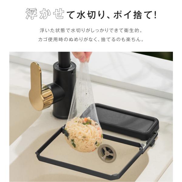 【浮かせて水切り、ポイ捨て!】浮いた状態で水切りがしっかりできて衛生的。カゴ使用時のぬめりがなく、捨てるのも楽ちん。