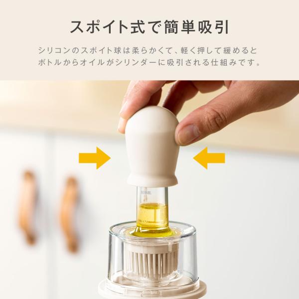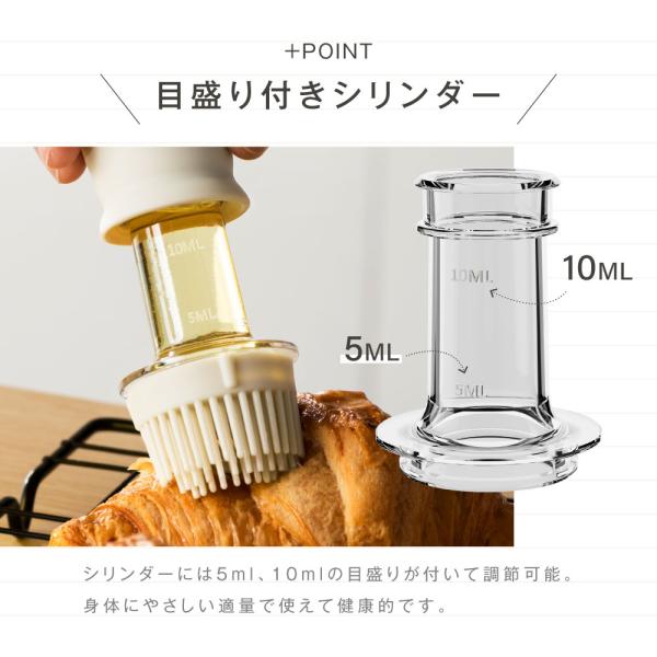 シリンダーには5ml・10mlの目盛り付きで適量調整も可能。油の使いすぎを防ぎ、健康的な料理に役立ちます。