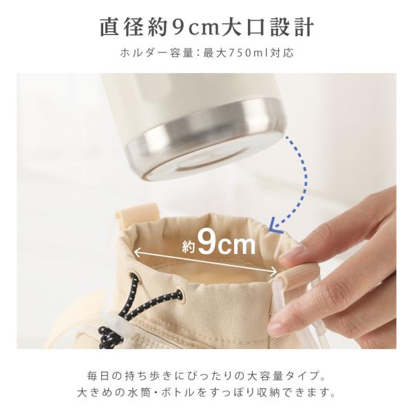 【直径約9cm大口設計】毎日の持ち歩きにぴったりの大容量タイプ。大きめの水筒・ボトルをすっぽり収納できます。水筒が飛び出さず、ひっくり返しても落ちなくて安心。