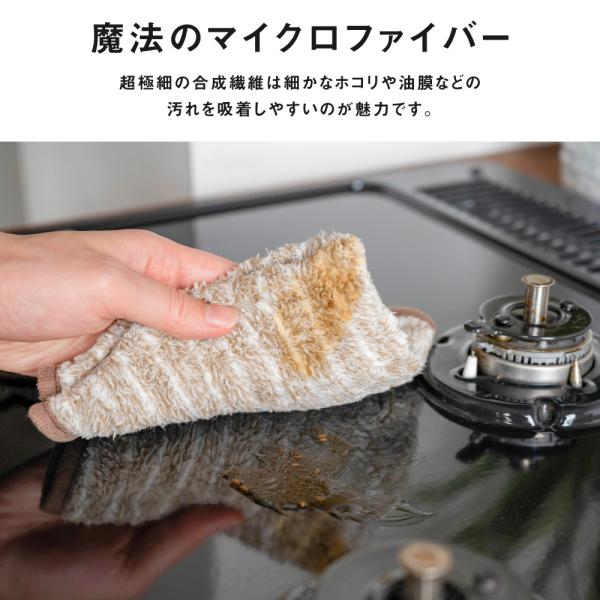 【油汚れ・水垢落とし/水拭きでOK】マイクロファイバーは細かなホコリや油膜などの汚れを吸着しやすいのも魅力です。コンロ周りのしつこい油汚れも水拭きだけでピカピカにします。蛇口やシンクの水垢、ヌメリも落として艶やかに拭き上げます。