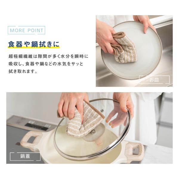 【マイクロファイバー/吸水速乾クロス】合成繊維のマイクロファイバーを使ったキッチンタオル。超極細の繊維は隙間が多く、水分を瞬時に吸収します。水洗いした食器や鍋などサッと拭き取れる吸水性に高く、さらに吸湿性が低くて絞ればすぐに乾く速乾性に優れます。キッチンの後片付けの時短になります。