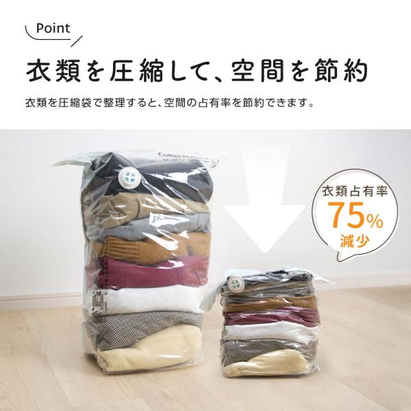 【立体型の圧縮収納袋/圧縮率約75%で省スペース】衣類や寝具カバー・シーツなど圧縮して収納する立体型収納袋2枚セット。圧縮率は約75%にもなるため、クローゼットなどの衣類占有率を減少させて、省スペースに節約できます。真空密閉なので、収納中の湿気やカビ、ダニから衣類を保護します。