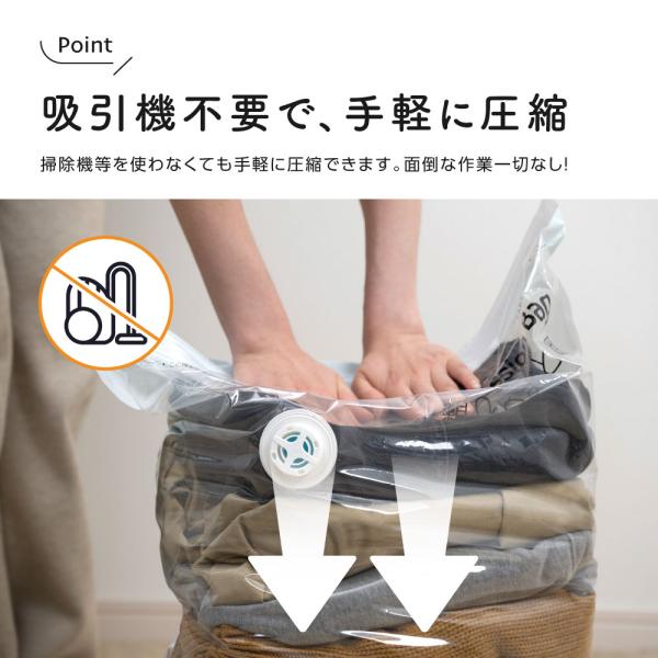 【手で押して簡単圧縮/軽い力でスピード排出】取り扱いは、衣類を折り畳んで入れたら上から手で押すだけ。空気を排出する高機能エアバルブにより一気に圧縮します。掃除機など電動吸引機を用意しなくてよく、女性の方でも軽い力でスピード排出が可能。空間だけでなく、体力も時間も節約できます。