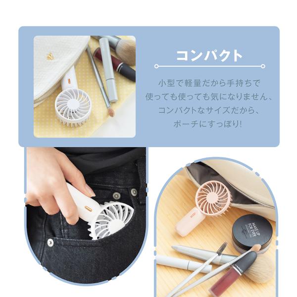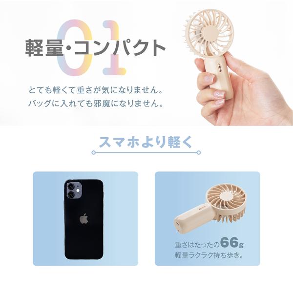 【2IN1・軽量】:コンパクトなサイズなので、手持ちファンとして顔に直接風を送ることもでき、いつでもどこでも涼しくて快適です。手ひらよりも小さい超ミニ携帯扇風機。サイズは市販タイプの約2分の1、わずか66gの超軽量で、手軽にバックに入れ、持ち運びに最適の小型扇風機です。