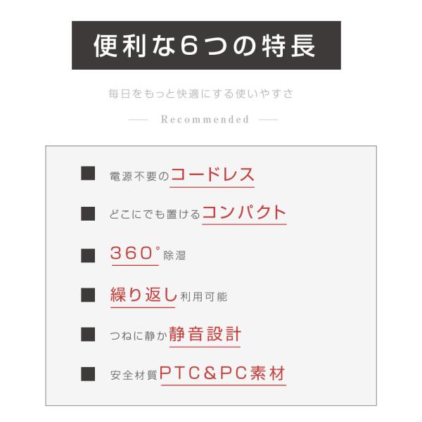 【電源不要のコードレス】 コードに足を引っ掛ける心配が無く、お子様やペットの手が届きにくい場所に設置できるので安心です。 【除湿量が一目で分かる】吸湿力が最も高い材質、シリカゲルを吸湿剤として採用。除湿ペレットが乾燥の時オレンジになる、だんだん湿気を吸うと褐色に変色します。季節に応じた除湿ができる冬場や梅雨時でも除湿能力が落ちにくく、年中快適です。