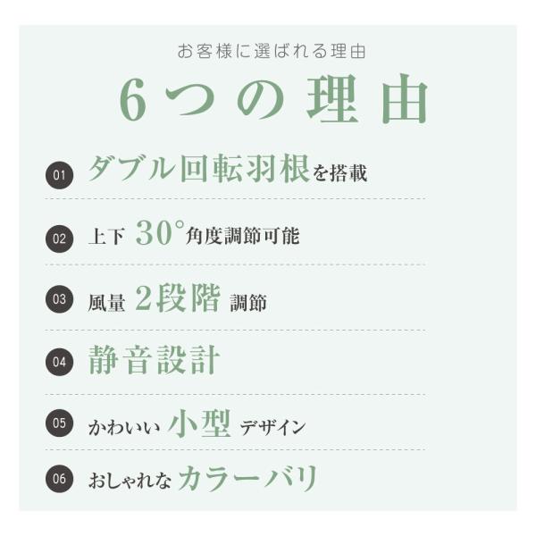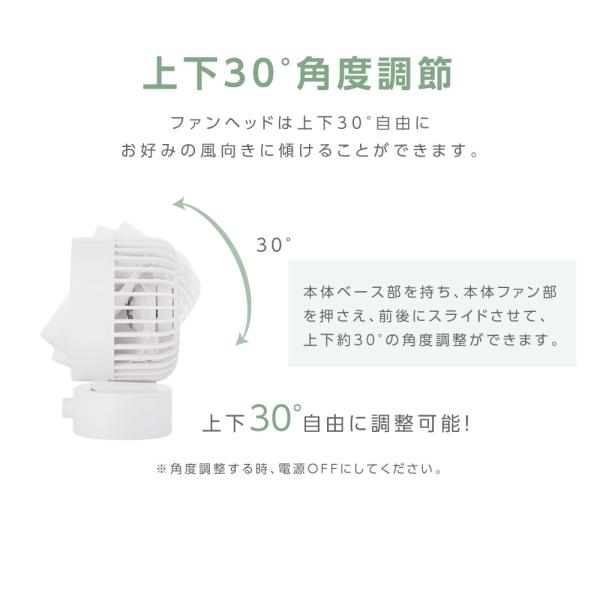 【上下30°角度調節&2段階風量調節】ファンヘッドは上下30°自由にお好みの風向きに傾けることができます。本体ベース部を持ち、本体ファン部を押さえ、前後にスライドさせて、上下約30°の角度調整ができます。風量調節もシンプルで簡単。弱と強のダイヤルを回すだけ!