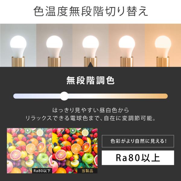 【無段階調光調色】調色(光の色)は、昼光色(6500k)〜電球色(3000k)までの間で無段階で調節可能。